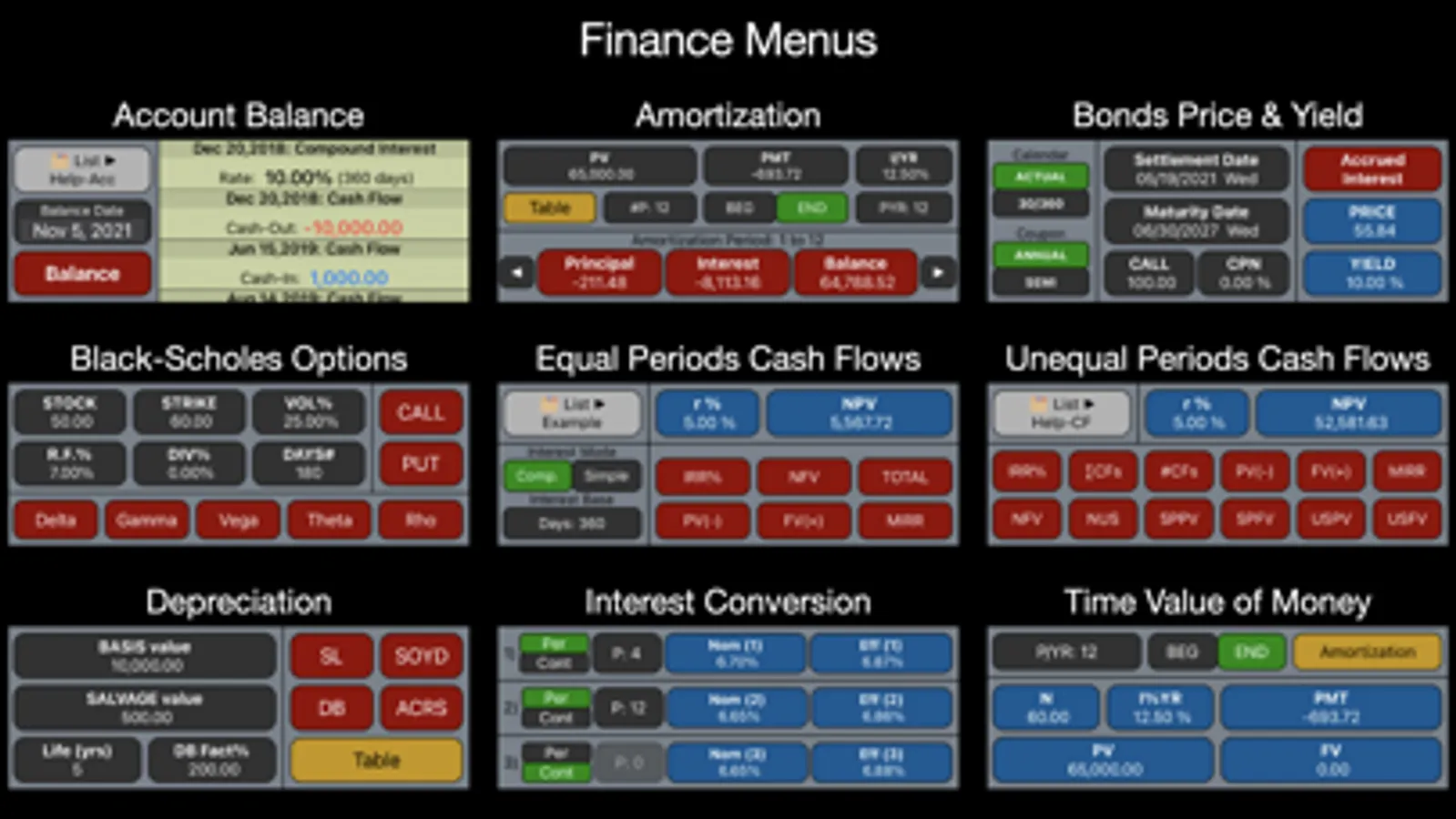 •Depreciation: Calculates depreciation with SL, SOYD, DB or MACRS methods and conventions.