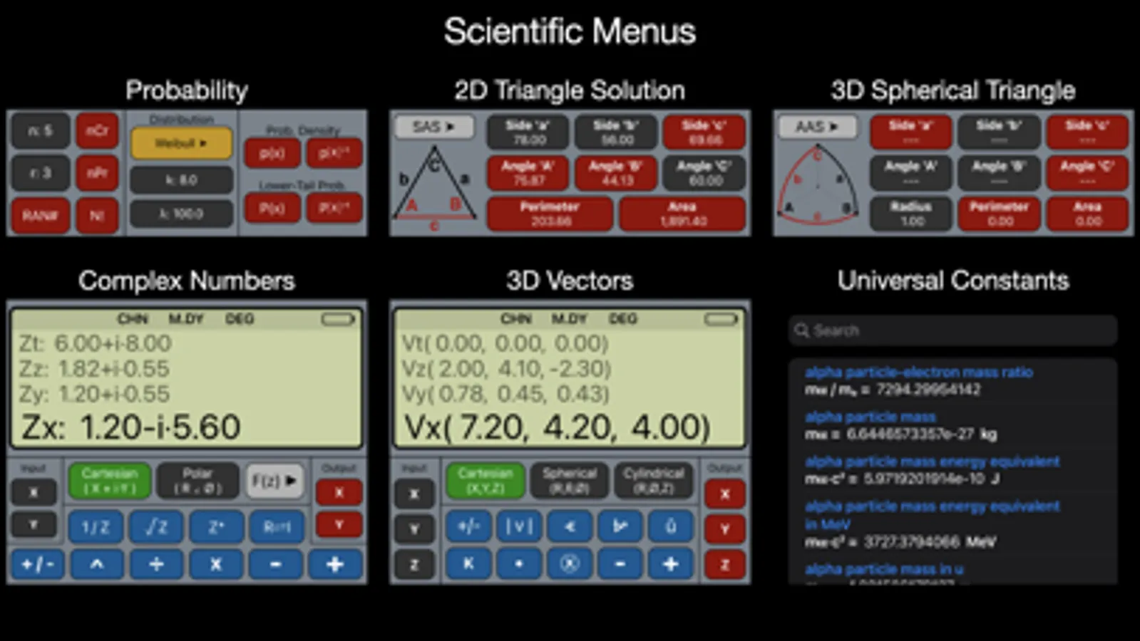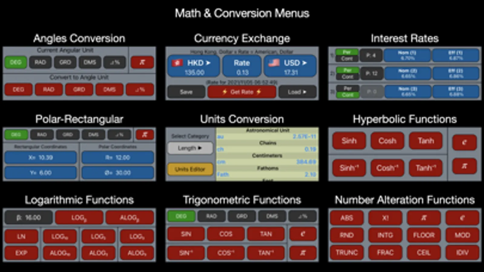 •Solver: Calculates arbitrary equations entered as text expression to solve any of the variables knowing the others.
