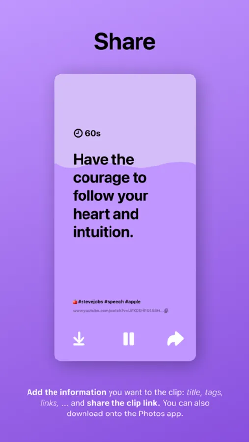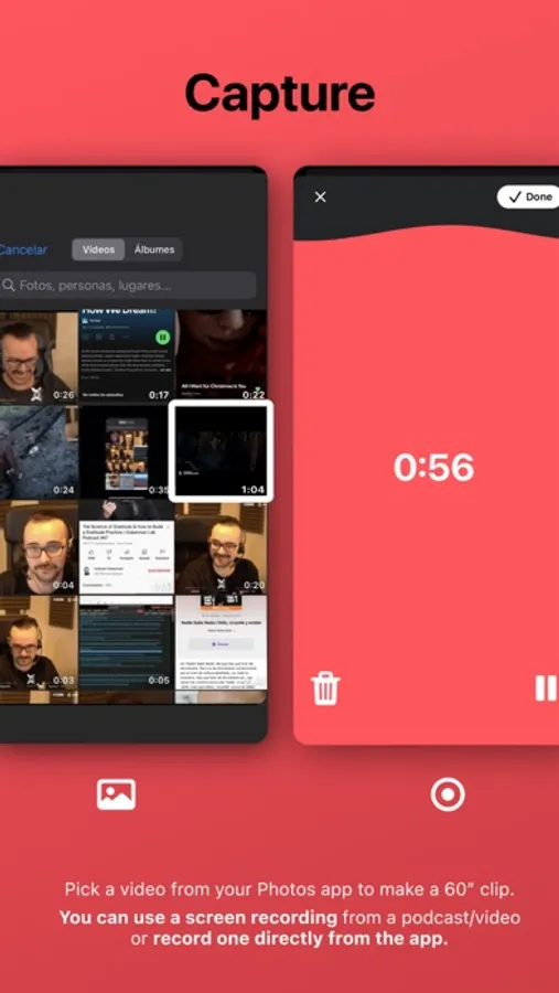• Pick a video from your Photos app to make a 60" clip. You can use an iOS screen recording from a podcast/video or record one directly from the app if you are feeling creative.