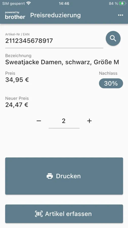 Our app, Price-Mark-Down Lite, enables retailers to reduce prices directly on the sales floor. Simply scan the barcode of the item or enter the EAN number to select the desired item. You can then select the percentage to reduce the price.