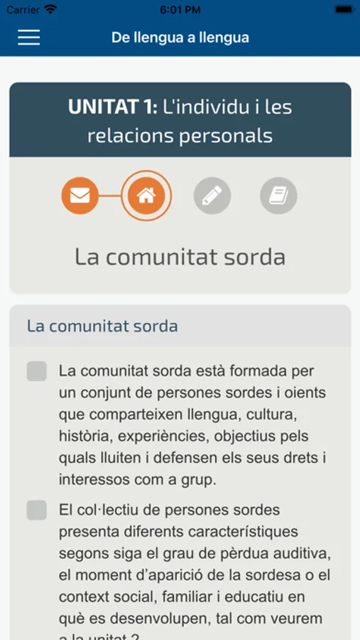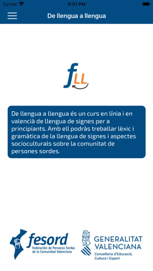 L'APP presenta una estructura simètrica que pretén facilitar l'aprenentatge de la llengua de signes a partir d'una plataforma senzilla, dinàmica i intuïtiva.