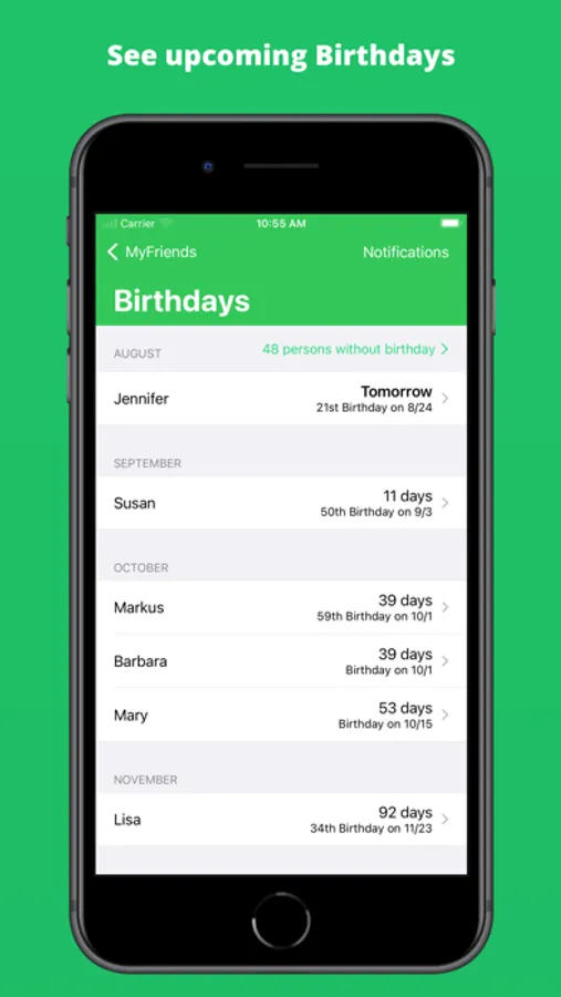 Gone are the days of struggling to remember birthdays or the names of those you seldom meet. MyFriends app ensures you stay on top of special occasions with automatic birthday reminders. Choose when you want to be notified – whether it's at 10:00 AM on the day itself or a thoughtful three days in advance, giving you ample time to prepare that perfect gift.
