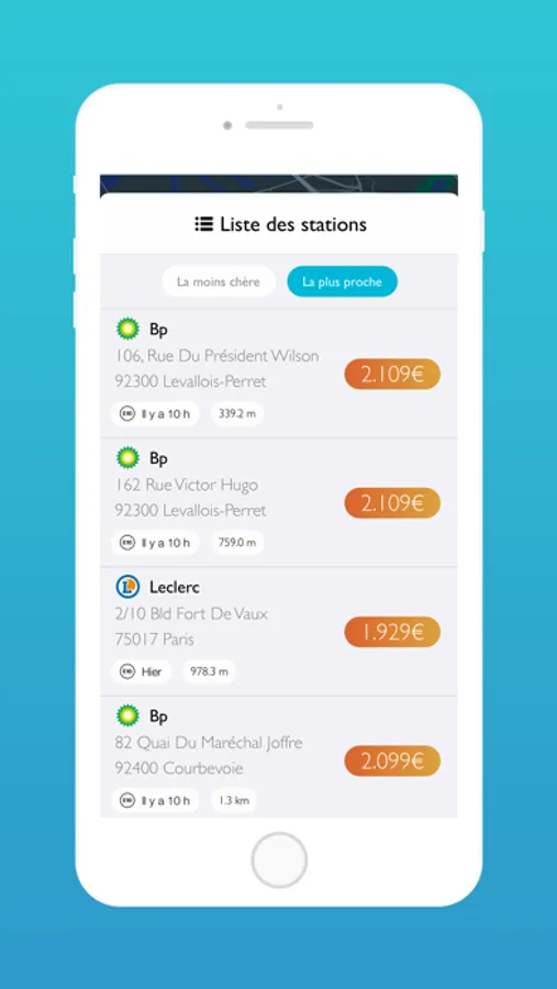- Affichage des stations les moins chères et les plus proches de votre position (carte ou liste)