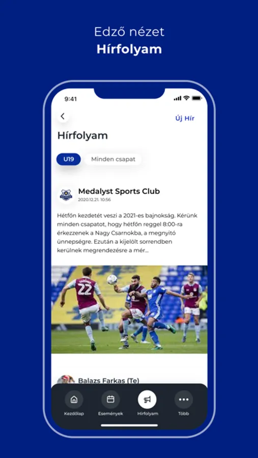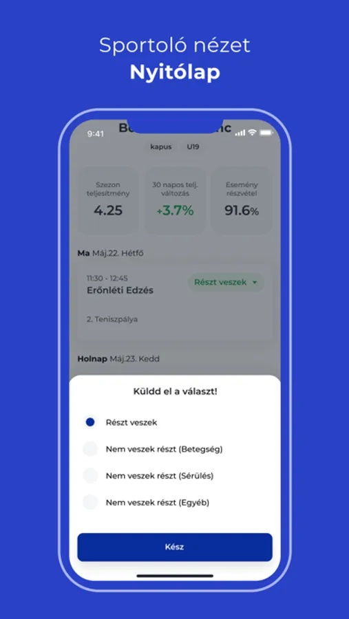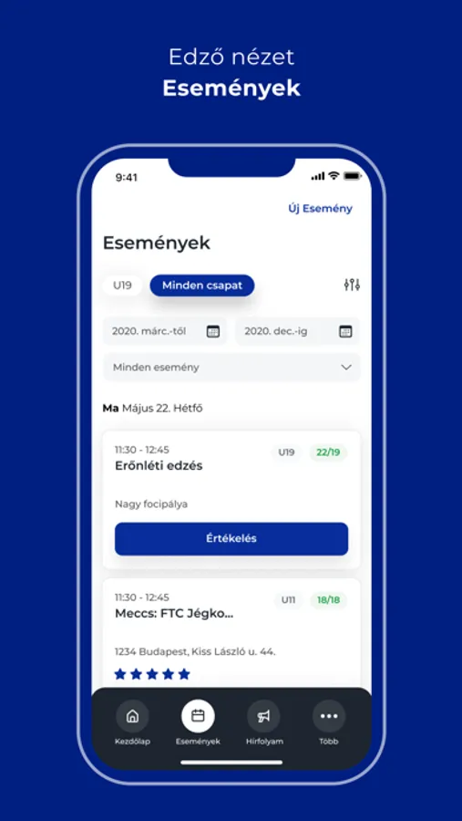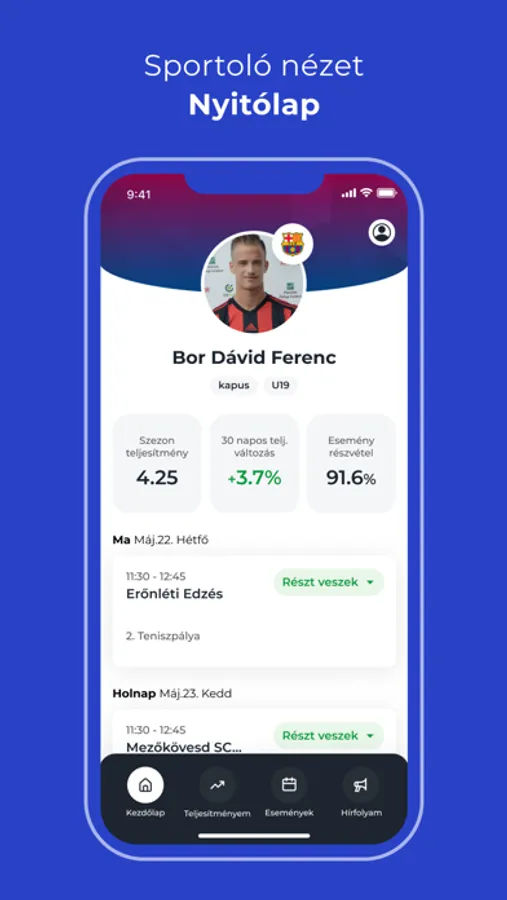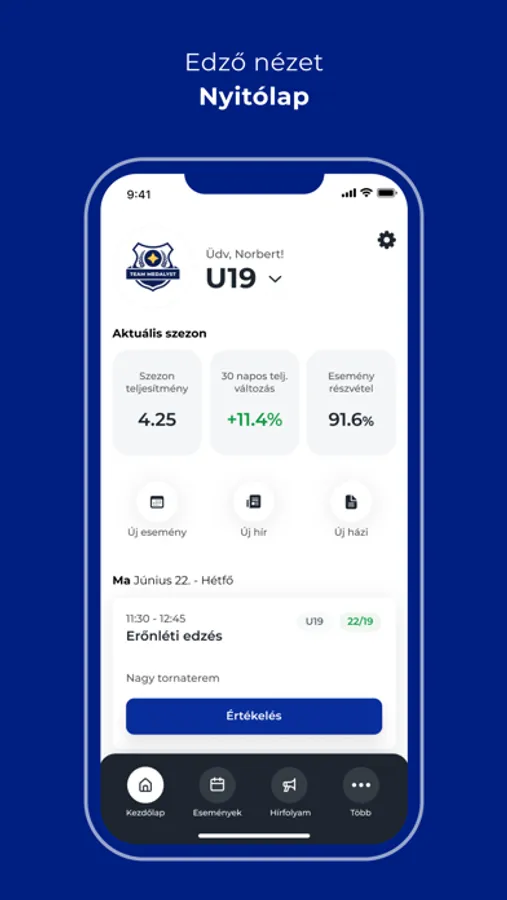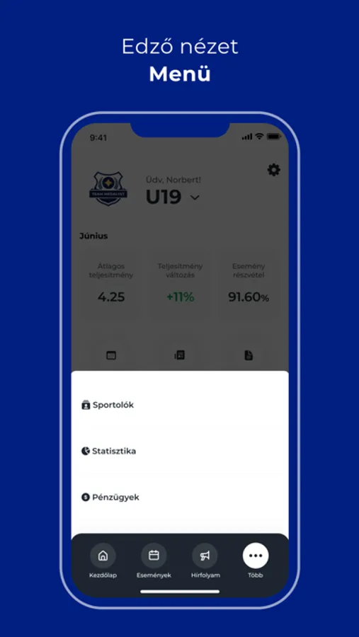 - események (edzések, mérkőzések, versenyek, házi feladatok és egyéb események) létrehozása, jelenlét és teljesítmény mérése