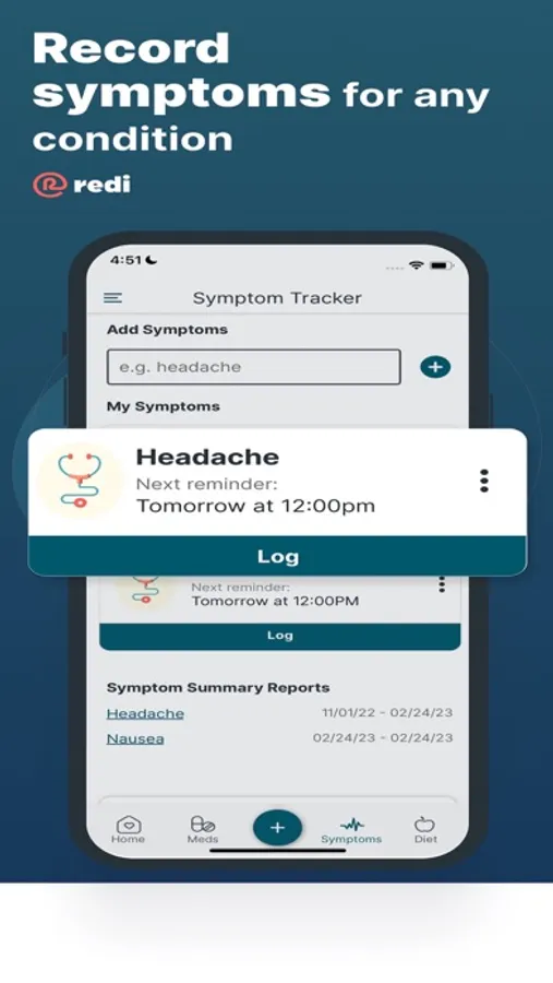 Manage any condition with our symptoms tracker that allows you to log & share your symptoms with your doctor. Headaches or other chronic symptoms can all be tracked & monitored with Redi Health.