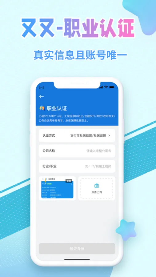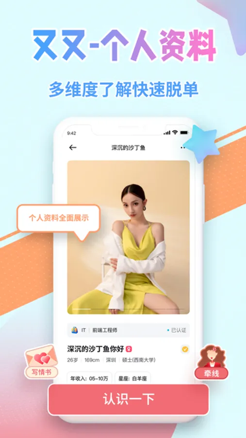 100%所有用户均通过职业证明和身份证信息双重认证审核,确保每一位用户都真实有效的同时还采用一人一号的注册规则,杜绝了杀猪盘、网络骗子等不良社会现象,给大家创造一个简单真诚的交友恋爱环境。