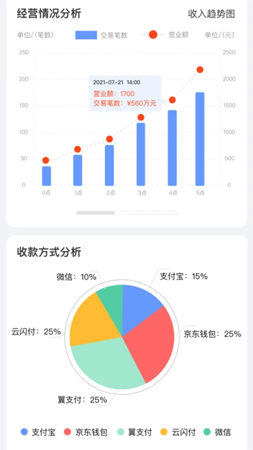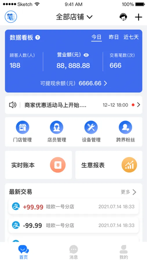 笔笔达APP实现了支付方式、支付场景、支付增值业务的融合,立志为商户打造更加便利、高效的收银管理平台工具,本APP主要给使用笔笔达聚合支付得商家及店员提供线上/线下聚合收款、经营数据查看、经营数据分析、总店分店管理、店员及硬件收款设备管理等一系列商家服务功能。