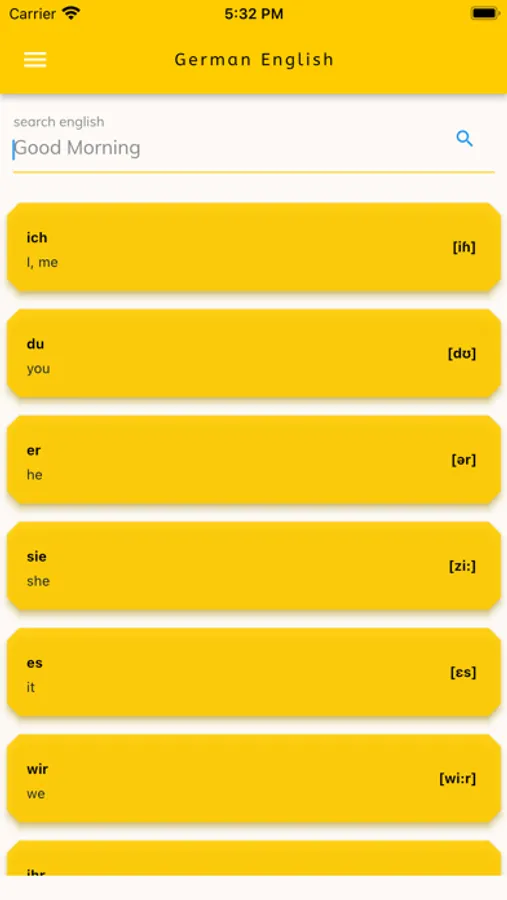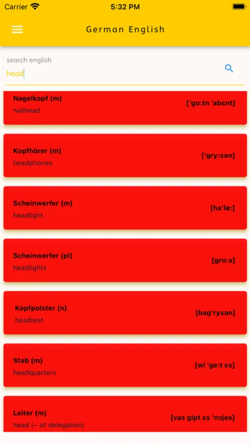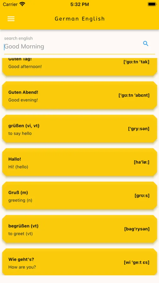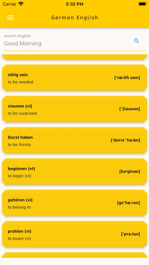 German English Dictionary and German English Translator contains 9000+ daily common speaking German to English words. It will bring you an excellent and great learning experience. You can search words in English language and then you will find that word in German language as well as in English learning word.