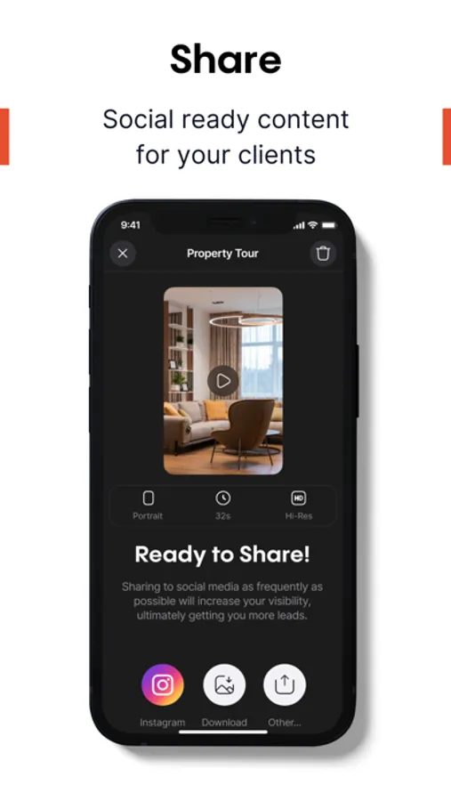 Easily share you branded videos to social, text, and email or download for the MLS, your website and more.