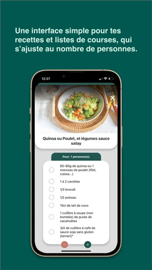 Chaque recette est imaginée pour 1 personne. Un bouton permet d'augmenter le nombre de personnes et les ingrédients se mettent à jour automatiquement afin d'adapter les recettes pour toute la famille.