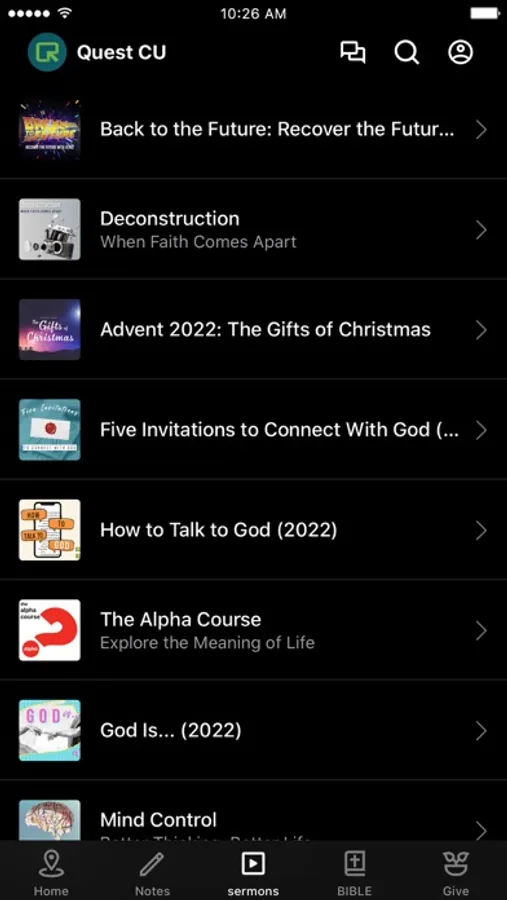 Welcome to the official app for Quest Church CU! Our mission is to help people be wholehearted followers of Jesus Christ. The app is the best way to stay current and connected with Quest. Our app lets you watch services and messages, message other app users, give, volunteer, sign up for events, and more!