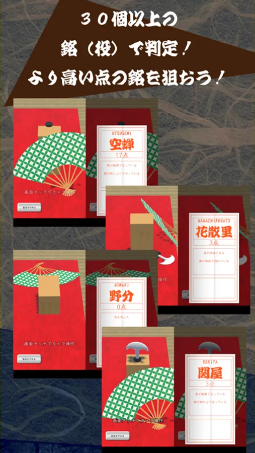 点数は投げた後の扇や蝶の位置、立っているか倒れているかなどによって点数が決まります。