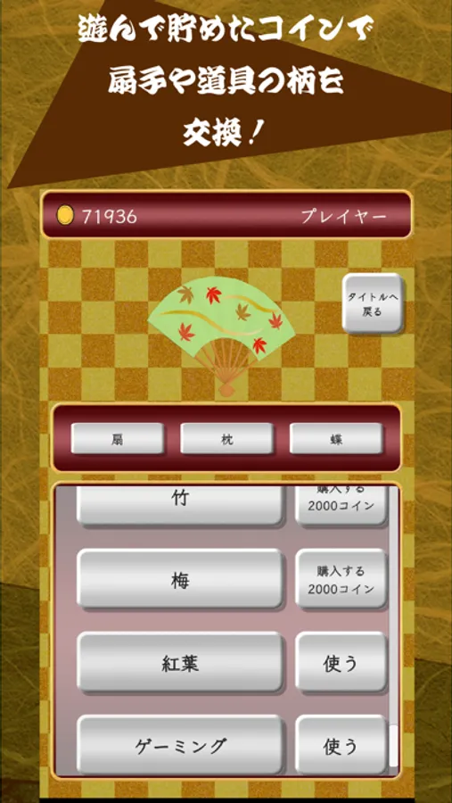 対戦によって集めたコインで扇子の色や柄を変えることもできます。