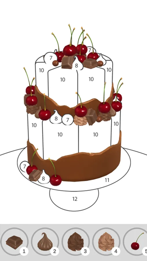 Paint beautiful cakes in 3D by coloring individual parts. Like a coloring book game, you paint by number. Choose a color from the palette then color by number each element until the cake is fully colorized.