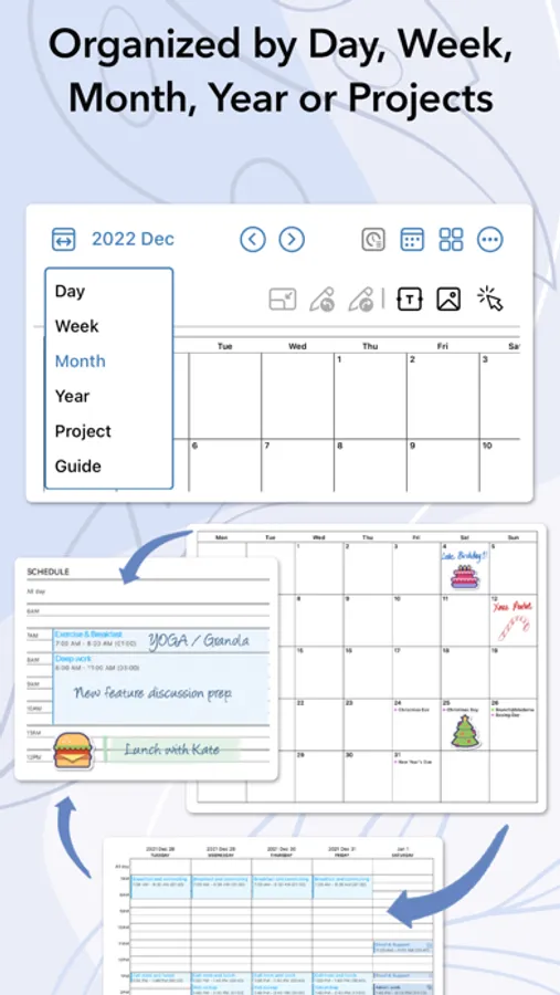 - Navigate effortlessly through journals/planners by dates, weeks, months, and projects