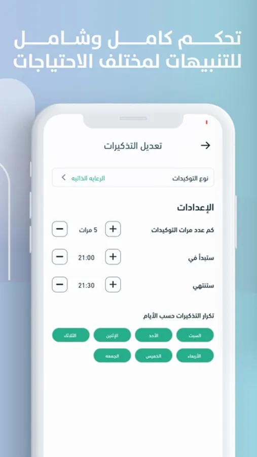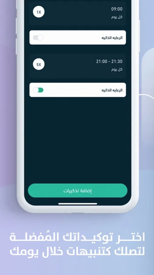 بناء على ماتشعر به خلال اليوم، وما ترى أنك محتاج له في يومك، اختر التصنيف المناسب، وحدد الوقت الذي تريد فيه أن يظهر لك التوكيدات
