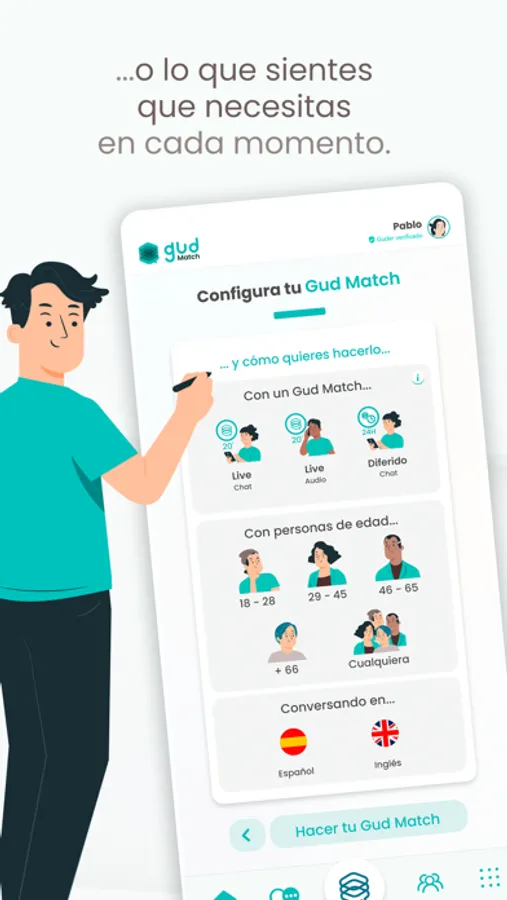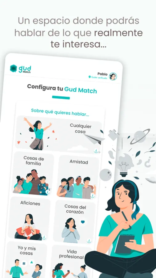 - Configura tus preferencias para cada encuentro: tema, tipo de Match, idioma, edad, chat y próximamente llamada.