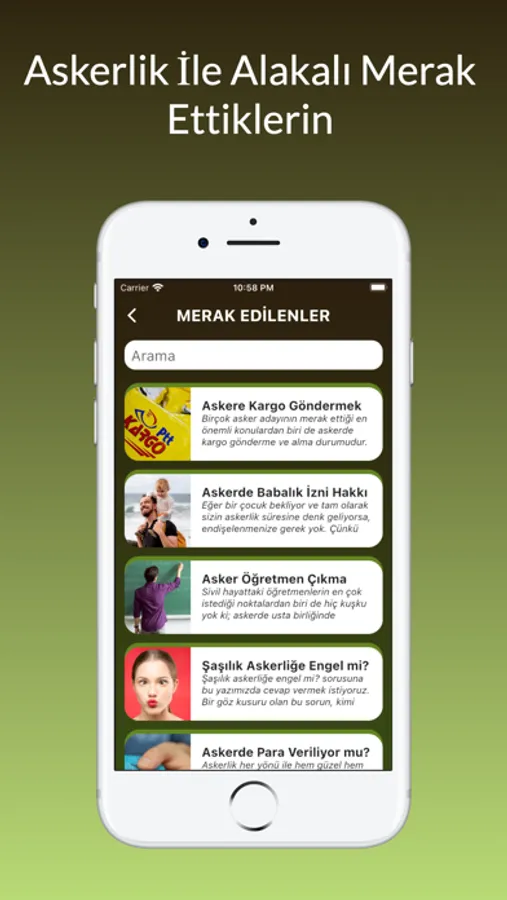 - Askerlik konusunda en çok merak edilen konuları derledik. Bunlardan en çok merak edileni ise askere kargo nasıl gönderilir. Bunun gibi merak ettiğiniz çoğu cevaba bu özelliğimizden ulaşabileceksiniz.