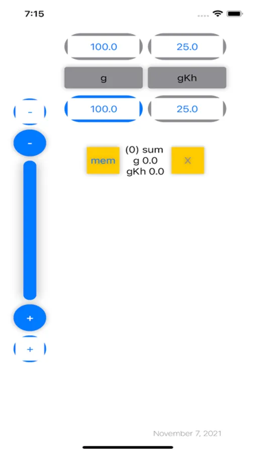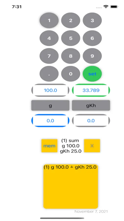 Werte zum bearbeiten antippen. Zielwerte Anpassen über scroll bar oder Eingabeblock. Zwischenergebnisse addieren mit mem/ "post it" (speichern über screen shot)