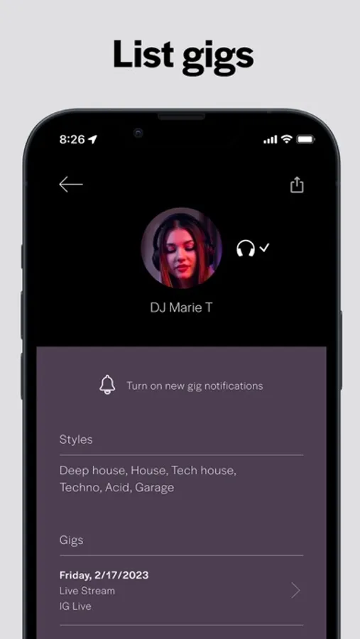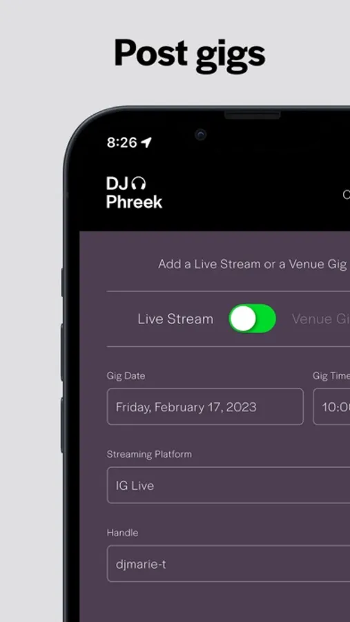 Post your gigs so your fans can receive alerts and add them to their calendar. Post live streams for whatever platform you’re on and gigs at clubs and events around the world.