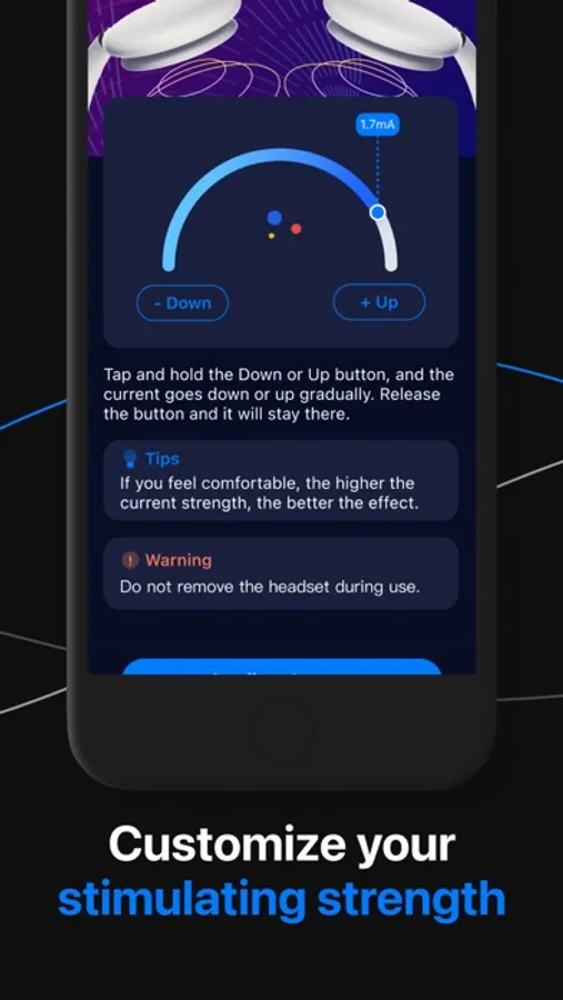 Just tap the + button to increase the current little by little till you reach 2mA at most. After setup, there is no need to open the app every time you start the stimulation unless you want to improve by increasing the current strength.