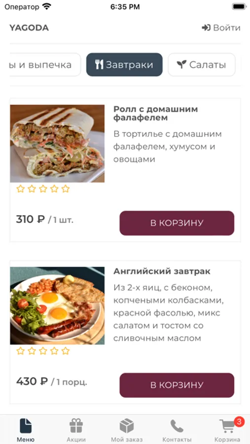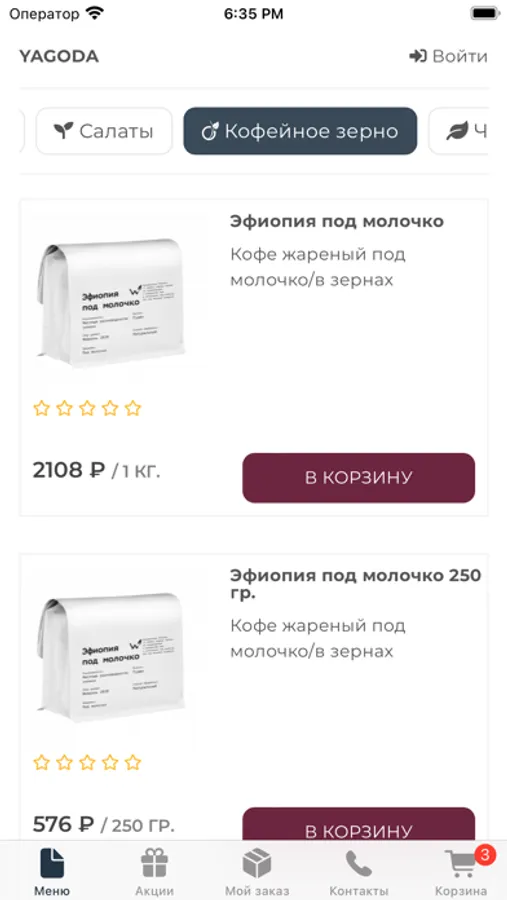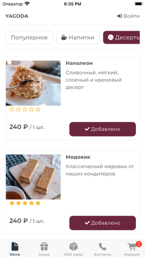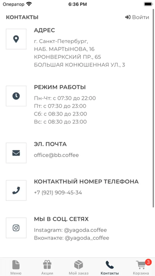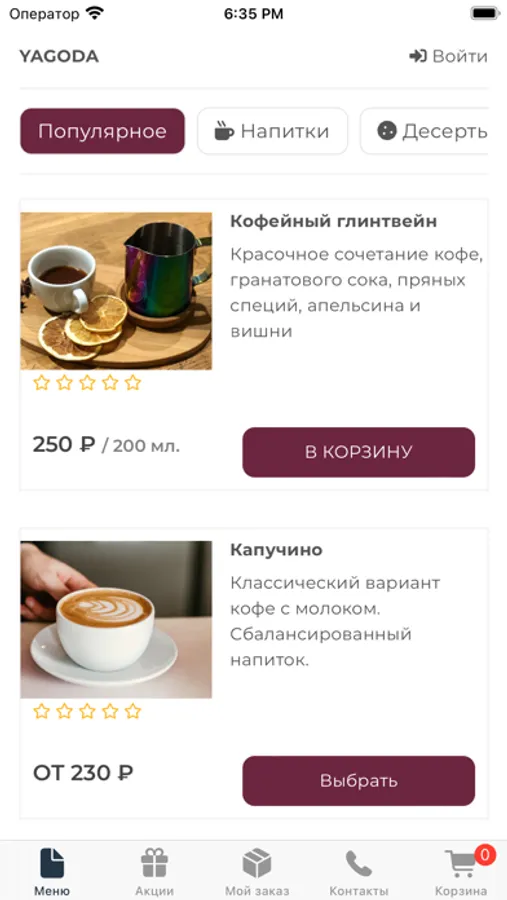 Официальное мобильное приложение предоставляет возможность оформить заказ на доставку или самовывоз в одной из кофеен YAGODA в Санкт-Петербурге