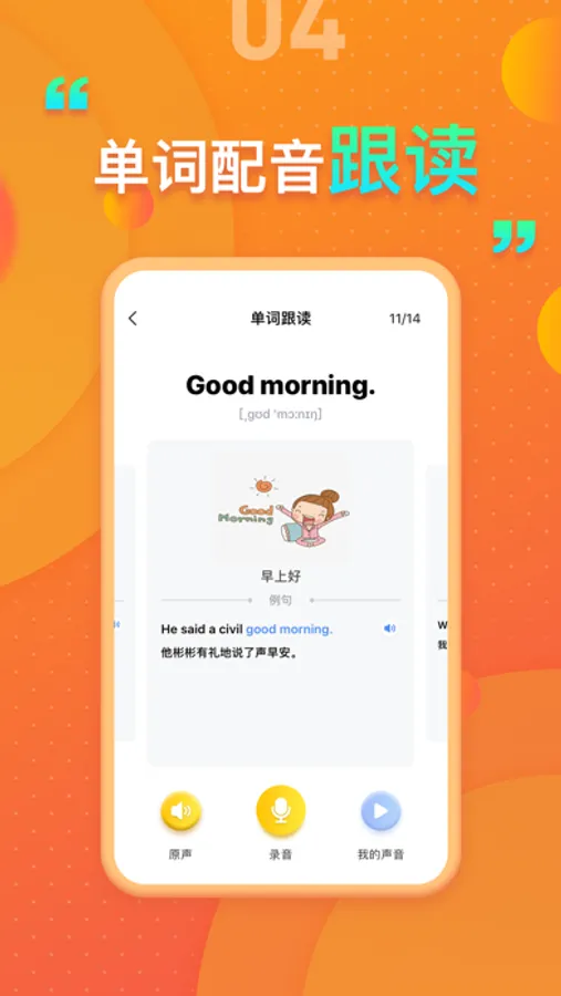 【单词跟读】:完整的单词和短语,配有图片和例句,还可跟读录音,听自己的发单是否标准;