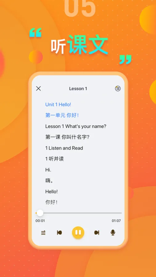 【听课文】:听课文是一项核心功能,音质高清,与课本内容同步,可点击任意一句,可录音跟读。