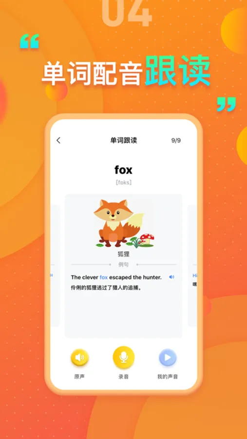 【单词跟读】:完整的单词和短语,配有图片和例句,还可跟读录音,听自己的发单是否标准;