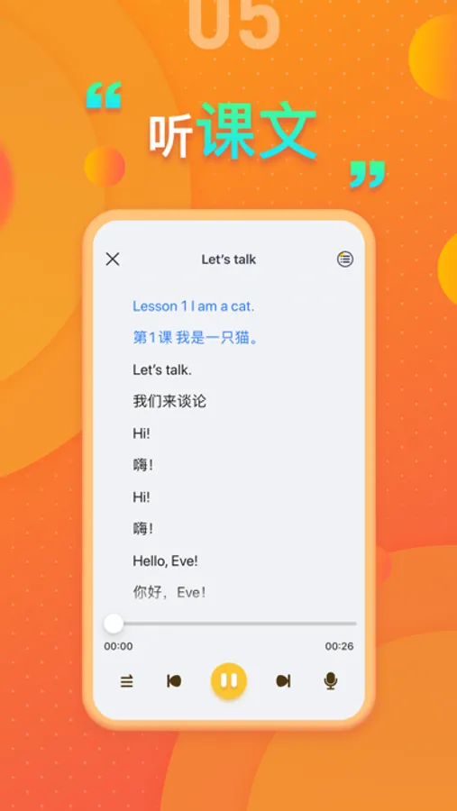 【听课文】:听课文是一项核心功能,音质高清,与课本内容同步,可点击任意一句,可录音跟读。