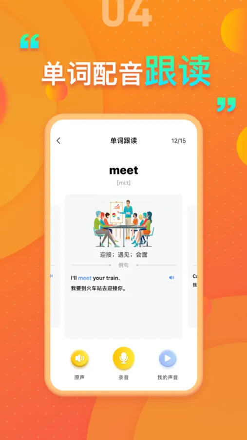 【单词跟读】:完整的单词和短语,配有图片和例句,还可跟读录音,听自己的发单是否标准;