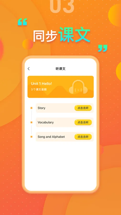 【听课文】:听课文是一项核心功能,音质高清,与课本内容同步,可点击任意一句,可录音跟读。
