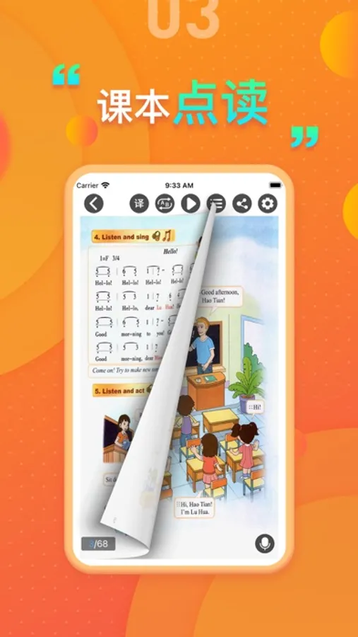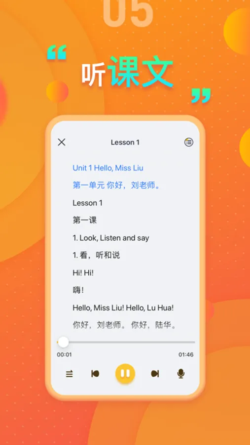 【听课文】:听课文是一项核心功能,音质高清,与课本内容同步,可点击任意一句,可录音跟读。