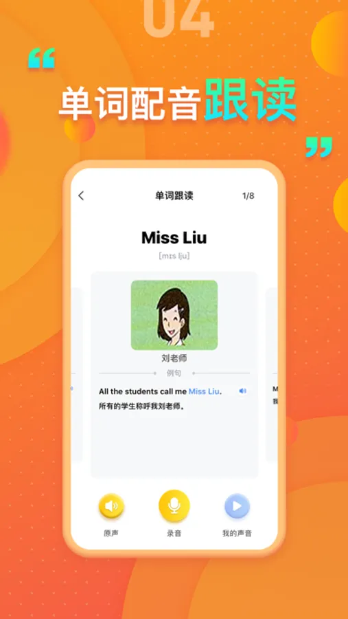 【单词跟读】:完整的单词和短语,配有图片和例句,还可跟读录音,听自己的发单是否标准;