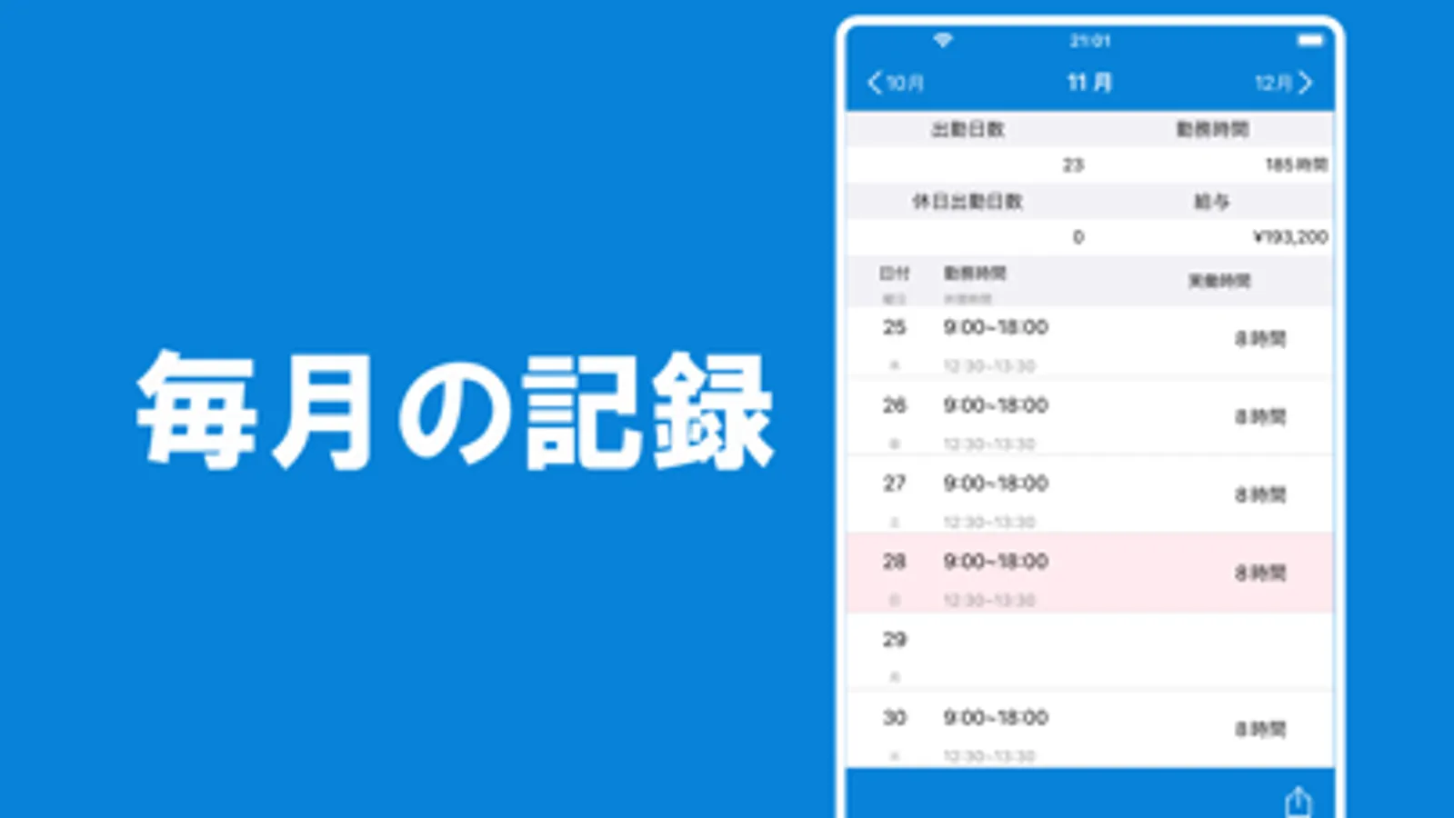 残業手当を含む給料の計算、勤務日数、勤務時間を分かりやすく表示