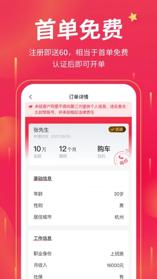 快客抢单专业为信贷经理、信贷员打造一个精准抢单获客展业平台。平台内拥有海量优质客户,助力快速抢单、开单。订单真实有效,通过地区和位置筛选,精准匹配服务,提高线下成单的成功率。全部订单先通过AI智能核实,然后释放,提高了客户需求的真实性,并帮助信贷经理信贷员降低获客成本,快速成为信贷圈销冠!