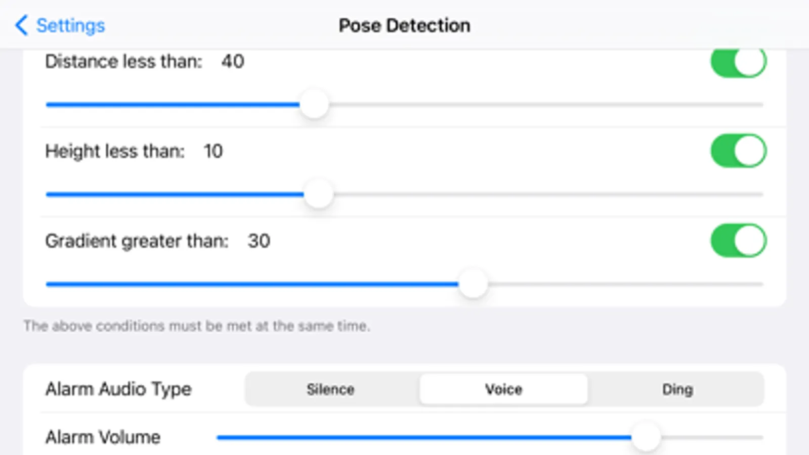 • Easy calibration, let the app speak out the readings for you when you adjust your positions, then you can set the thresholds(distance, height, gradient)