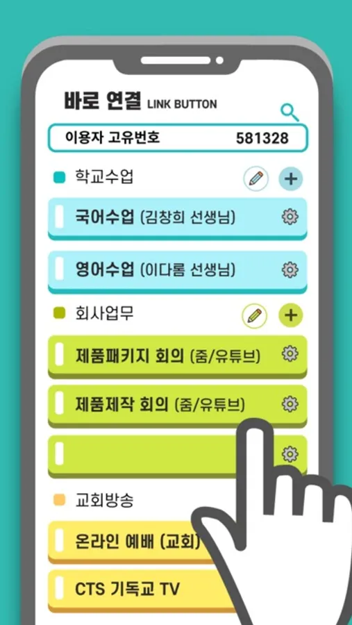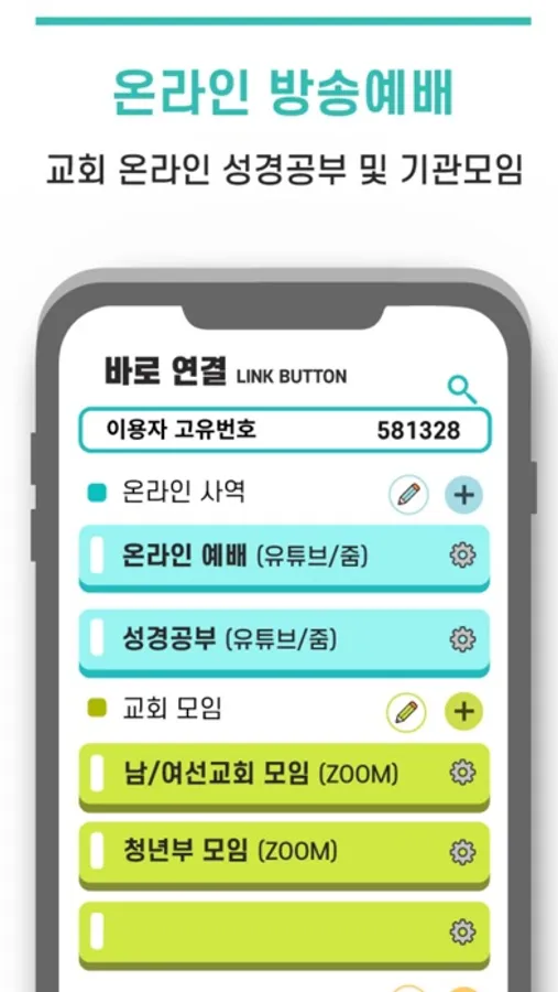 교회나 학교, 회사, 병원 및 학원 용으로 홈페이지 개념으로 꾸며 소속된 맴버들이 연결 버튼의 터치로 저장된 링크를 통해 바로 연결되게 하는 앱으로 교회의 온라인 예배 및 성경 공부, 각종 모임, 직장 회의, 줌을 통한 학교 수업, 원하는 인터넷 사이트, 전화 번호등을 앱의 연결 버튼에 카테고리별로 저장하여 편리하게 사용할 수 있습니다. 또한 카테고리 이름 변경 기능, 연결 버튼의 순서 변경 기능, 버튼 검색 기능이 있고 버튼 설정 화면을 홈페이지 개념으로 세팅해드립니다.