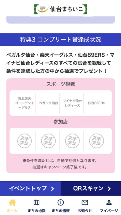 ・イベント: アプリユーザーは、仙台市内で開催されるスタンプラリー等のイベントに参加できます。条件を達成すると、抽選で特典を獲得するチャンスがあります。イベントは随時追加される予定です。