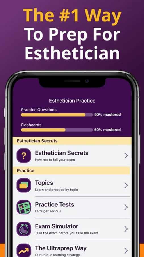 5000+ exam-like questions, 1000+ flashcards, over a dozen practice tests and real-life scenarios make Ultraprep the leading Esthetician app on the market today.