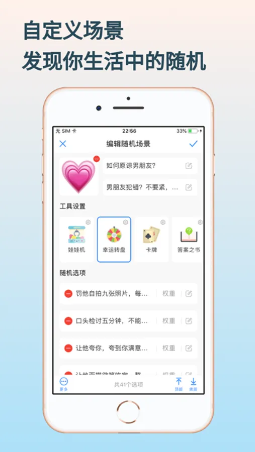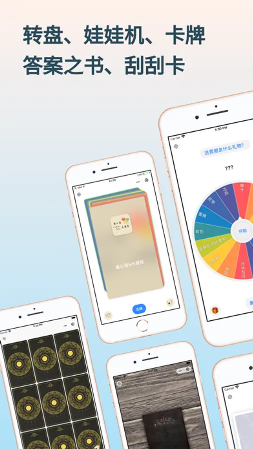 - 自定义随机场景,可使用娃娃机、幸运转盘、卡牌、答案之书、刮刮卡等多种工具