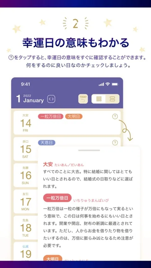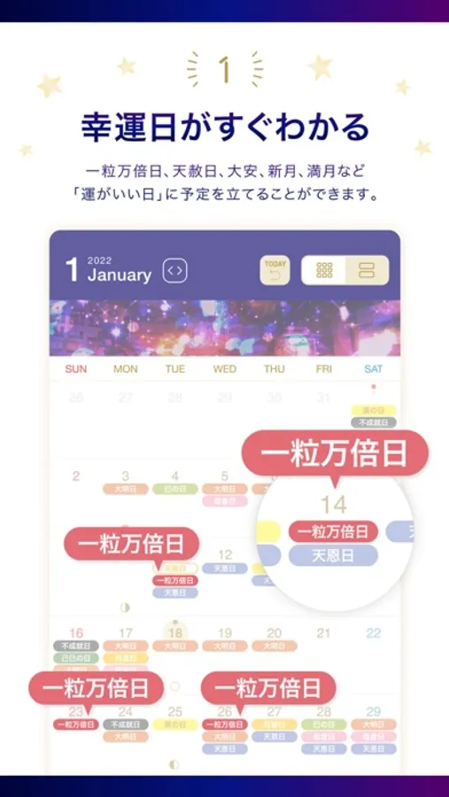 一粒万倍日、天赦日、大安、新月、満月など「運がいい日」がすぐわかります。幸運日に予定を立てて素敵な毎日を過ごしましょう。