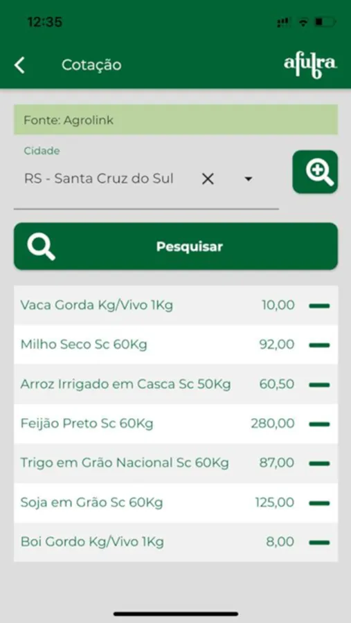 Acesse a cotação diária das commodities, com filtro de cidade, cultura, produto e período;