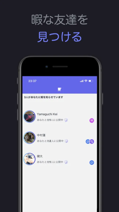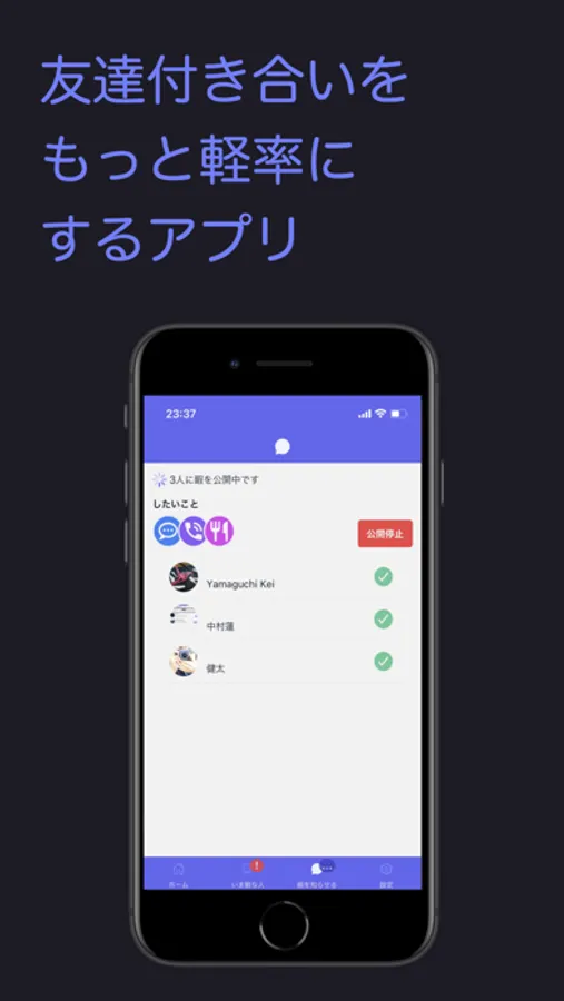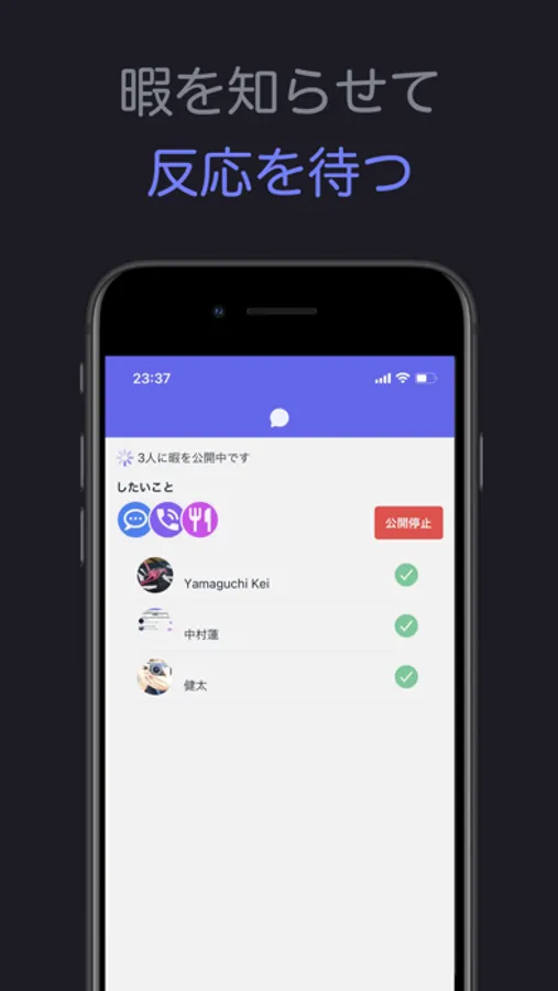このアプリは、「自分が今暇である」ということを特定のメンバーに知らせて、相手から何かしらの反応を待つだけのアプリです。