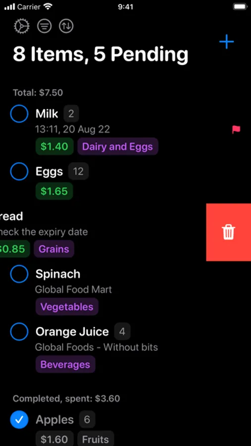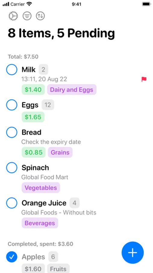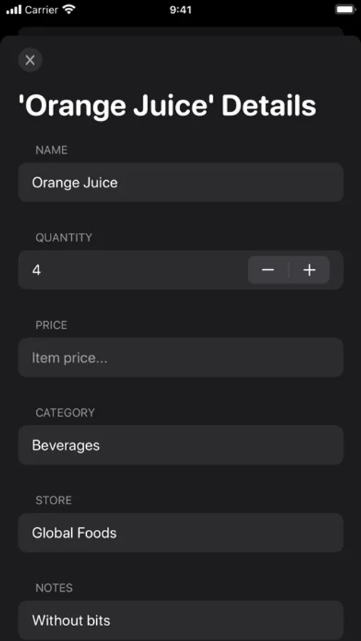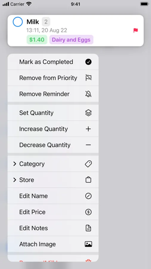 - Assign quantities, prices, categories, stores, notes, reminders, and images to items