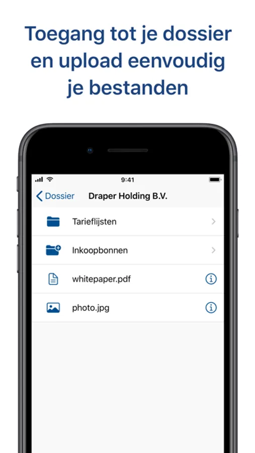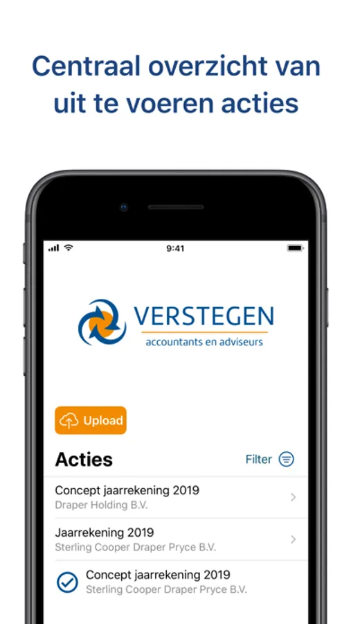 U kunt in de Mijn Verstegen - accountancy client portal app op ieder moment en overal zelf uw dossier inzien, specifieke documenten bekijken en deze eventueel opslaan of openen in andere apps. Bovendien kunt u bestanden als facturen en contracten makkelijk met ons delen, door er een foto van te maken of ze te uploaden vanaf uw telefoon.