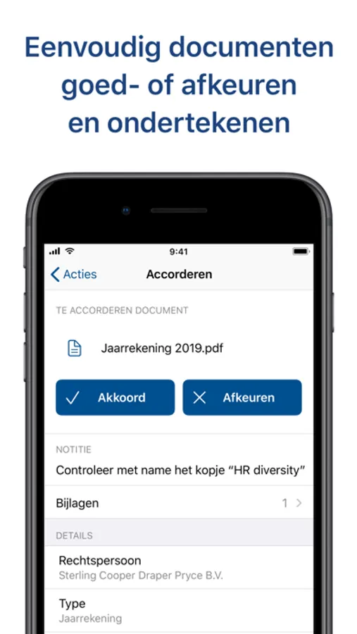 Keur in een paar seconden documenten als belastingaangiften en jaarrekeningen goed. Deze kunnen daarna direct worden verstuurd naar bijvoorbeeld de Belastingdienst of Kamer van Koophandel. U krijgt een push notificatie als u een document kunt goedkeuren.