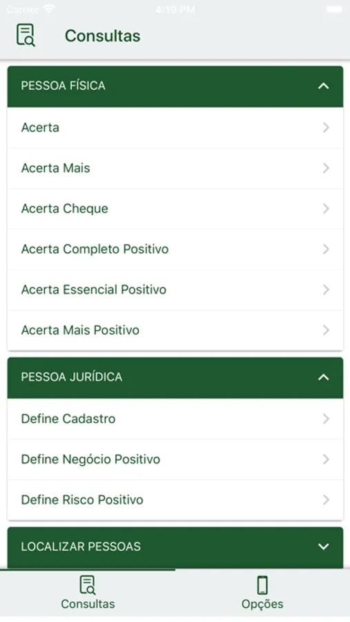 Além das consultas mais habituais, e o score de crédito, também estão disponíveis neste aplicativo as consultas das famílias Acerta e Define.