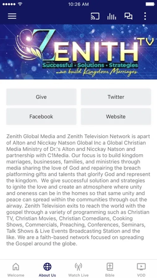 Zenith Global Media and Zenith Television Network is apart of Alton and Nicckay Natson Global Inc a Global Christian Media Ministry of Dr.'s Alton and Nicckay Natson and partnership with C1Media. Our focus is to build kingdom marriages, businesses, families, and ministries through media sharing the love of God and repairing the breach platforming gifts and talents that glorify God and represent the kingdom. We give successful solution and strategies to ignite the love and create an atmosphere where unity and oneness can be in the homes so that same unity and peace can spread within the communities throughout the airways. Zenith Television exits to reach the world with the gospel through a variety of programming such as Christian TV, Christian Movies, Christian Comedians, Cooking Shows, Commercials, Preaching, Conferences, Seminars, Talk Shows & Live Events Broadcasting Station and the like. We are a faith-based network focused on spreading the Gospel 365 days a year, 24 hours a day, and 7 days a week throughout the globe.