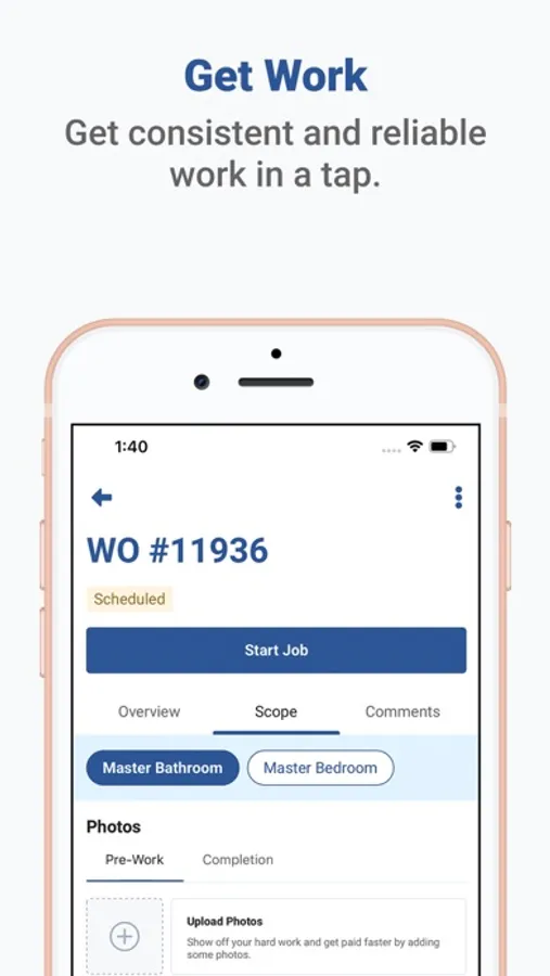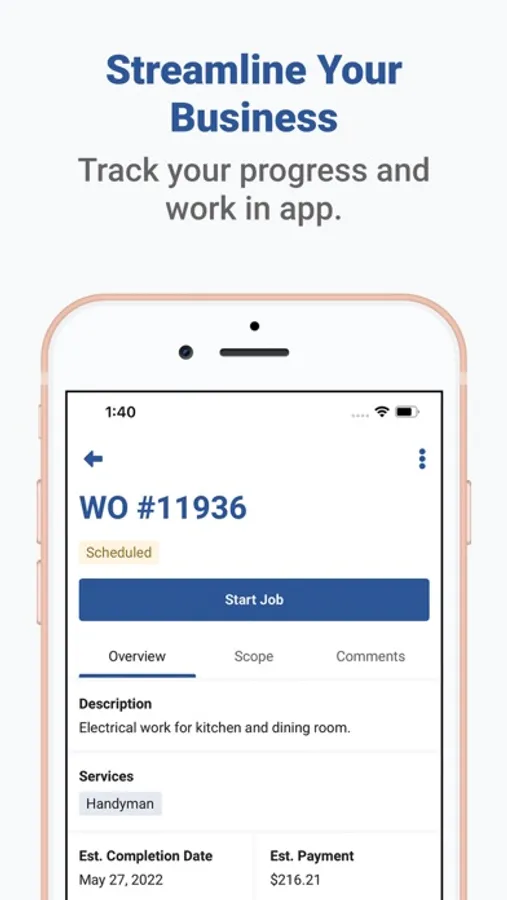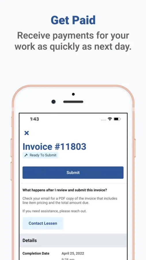 The Lessen Pro app is an application utilized by our network of service professionals to help manage work orders and streamline the onsite validation process into one simple system. It enables real-time communication and work order visibility between the Pro and Lessen. The Lessen Pro app improves the workflow process for service professionals in the following ways: